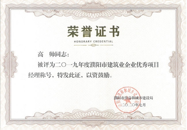 項目經(jīng)理高帥榮獲2019年度濮陽市建筑業(yè)企業(yè)優(yōu)秀項目經(jīng)理