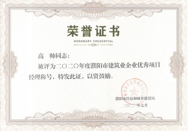 項目經(jīng)理高帥榮獲2020年度濮陽市建筑業(yè)企業(yè)優(yōu)秀項目經(jīng)理稱號